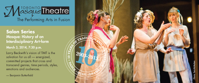TONIGHT! Masque: History of an Interdisciplinary Art-form… Learn about the history of masque and how this traditional art-form is being reinvented for the 21st century. Performance by soprano Patricia O’Callaghan, guitarist Ken Whiteley and others. Also features novelist/poet Stephen Heighton, U of T professor Katie Larsen and artistic director of the Toronto Masque Theatre, Larry Beckwith.